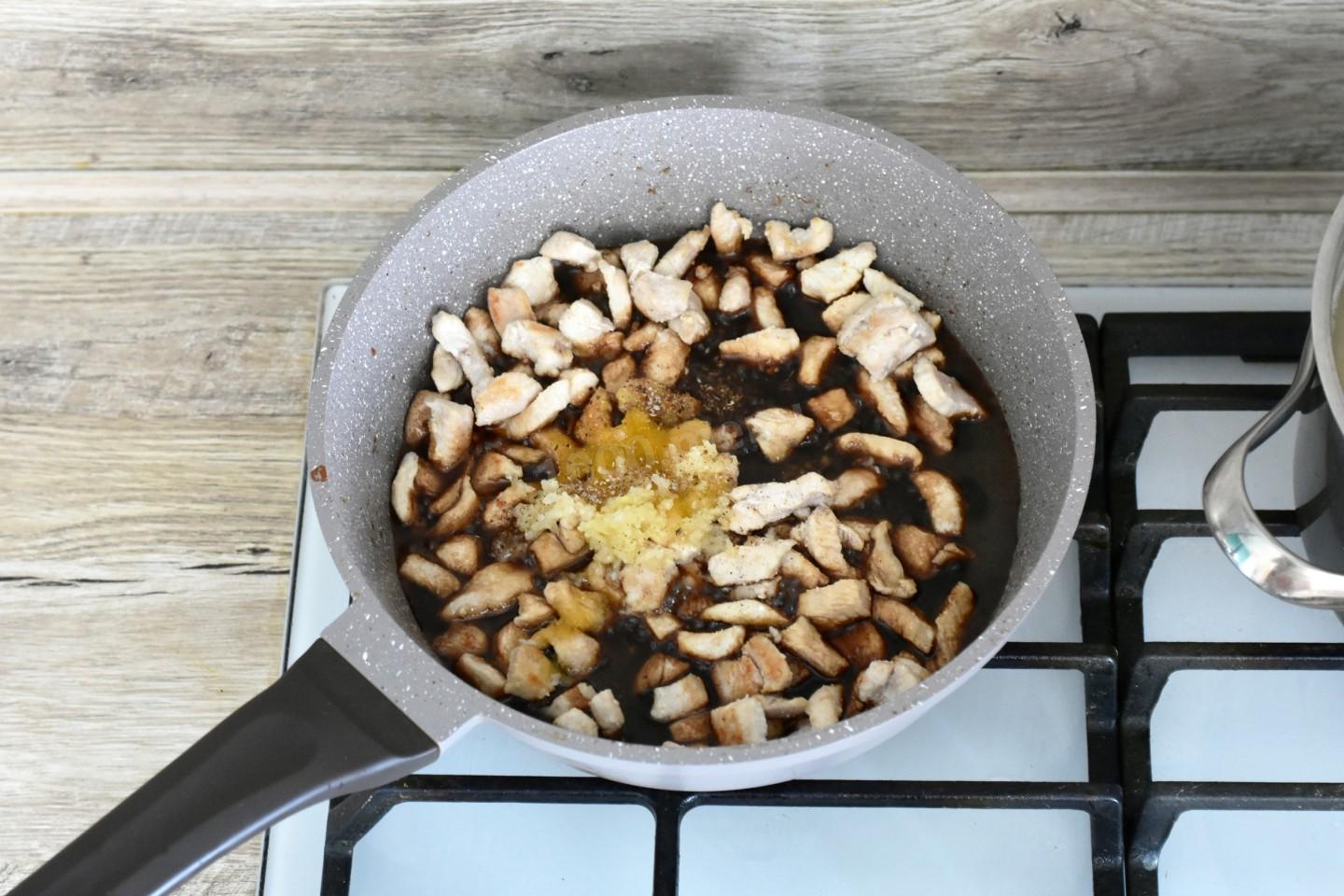 Добавьте к курице соевый соус, мед, лимонный сок, пропущенные через пресс зубчики чеснока и специи. Тушите, периодически помешивая, на медленном огне под крышкой около 10 минут. При добавлении соевого соуса в блюдо стоит учесть, что он имеет достаточно соленый вкус. Уменьшите общее количество соли, иначе рискуете пересолить.