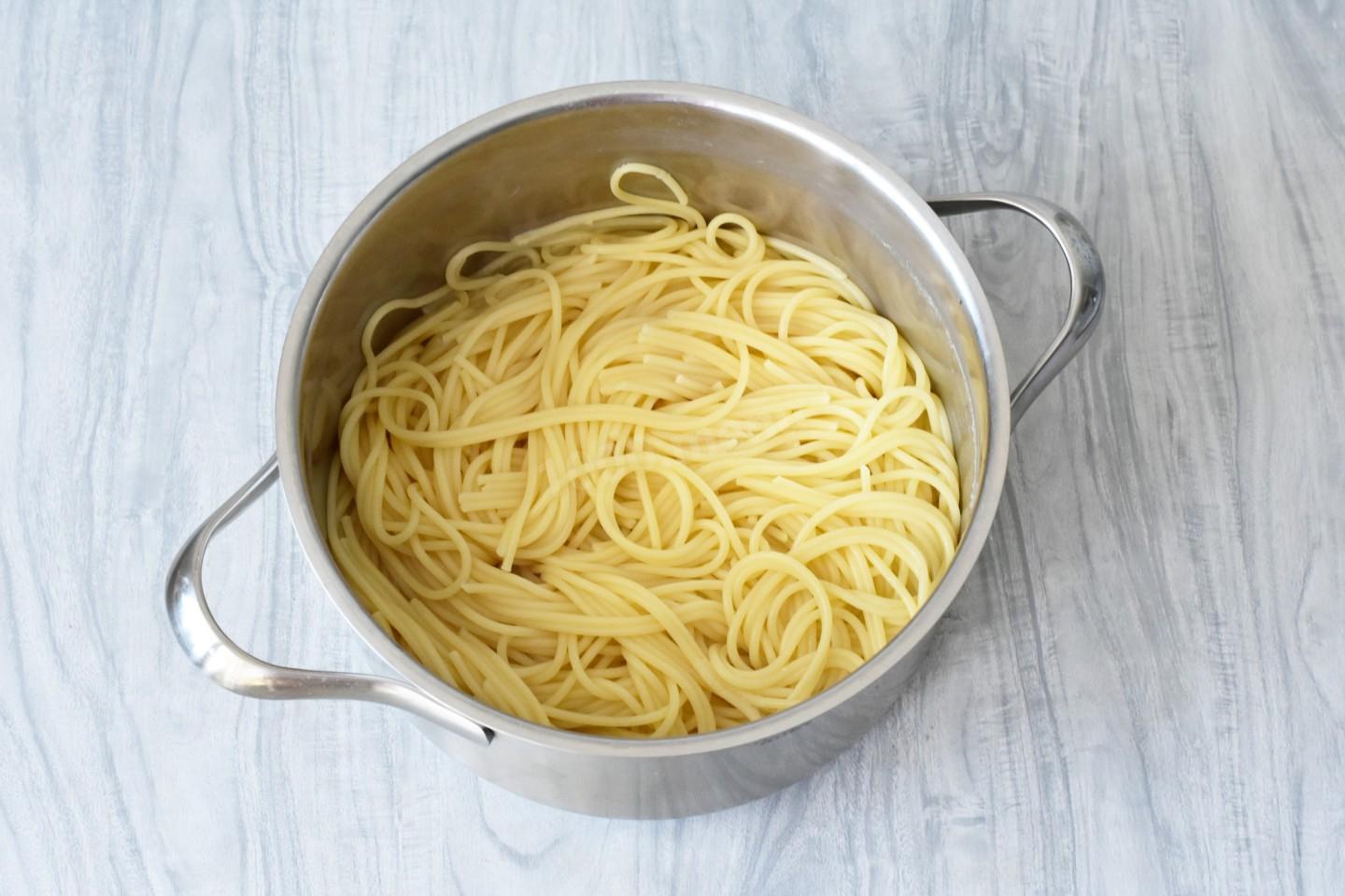 В кипящую подсоленную воду выложите макароны и отварите до состояния al dente примерно 7-8 минут (на одну минуту меньше, чем указано на упаковке). Если у вас другие виды пасты, то время варки может отличаться - смотрите инструкцию на упаковке. Воду слейте. О том, как выбрать кастрюлю читайте в статье, ссылка под рецептом. Готовую пасту откиньте на дуршлаг, сохранив 200 мл отвара.
