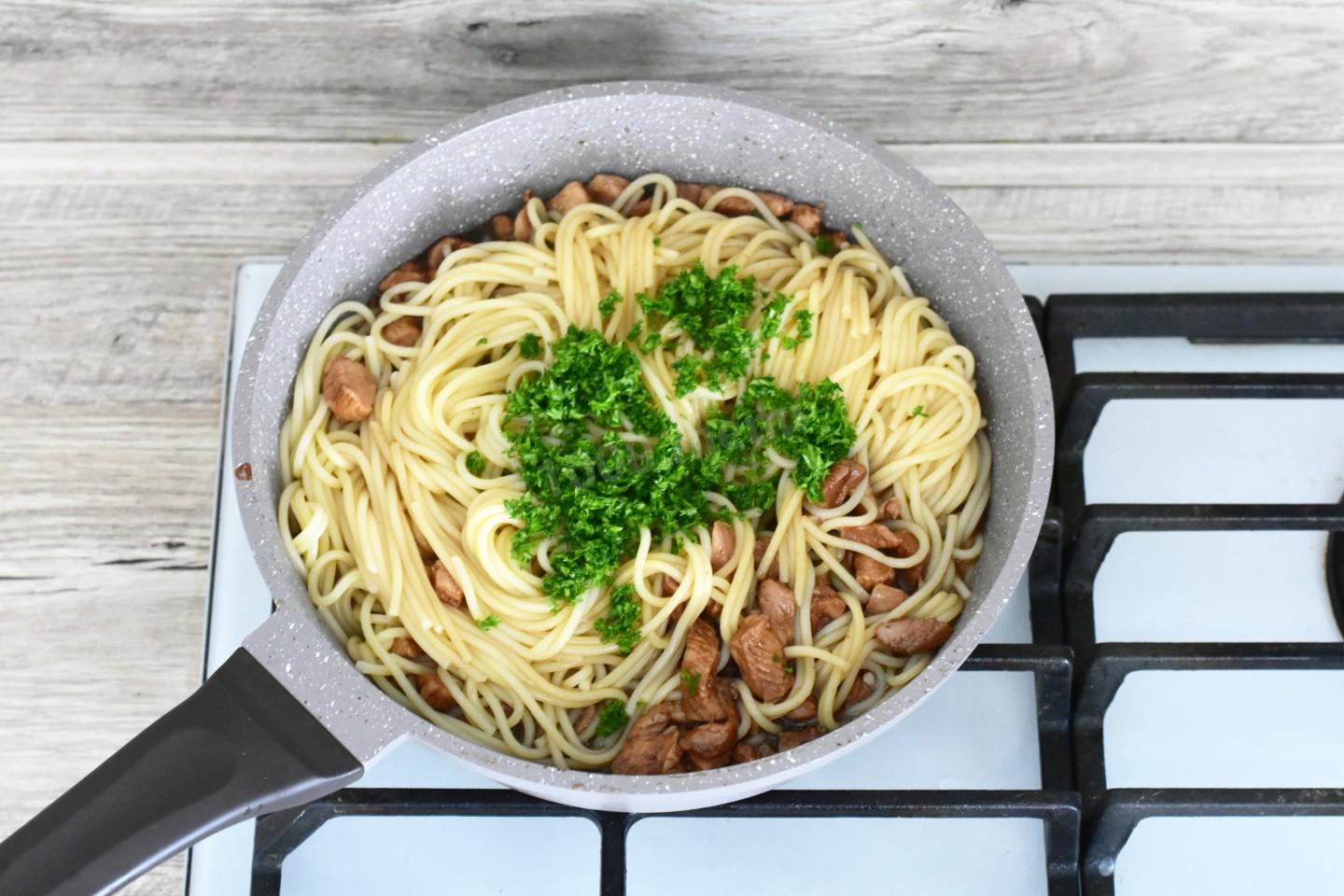 Выложите макароны в сковороду к курице. Добавьте измельченную зелень. Прогрейте все вместе 1 минуту. Если соус сильно загустел, влейте необходимое количество отвара от макарон.