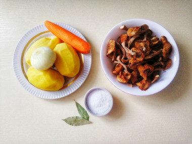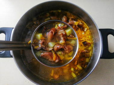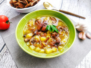 Варила суп на курином бульоне. Опята предварительно залила водой, они быстро стали мягкие, тогда я их нарезала и переложила в кастрюлю с бульоном. Затем добавила картошку, а в конце готовки - зажарку из лука и моркови (овощи жарила на растительном масле вместо сливочного). От себя добавила в суп лавровый лист для аромата.