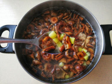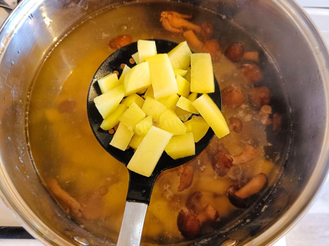 Добавьте картофель к грибам. Варите около 10 минут.