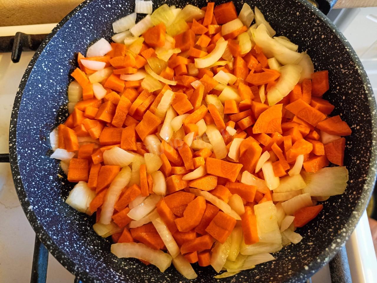 На разогретом растительном масле обжарьте лук пару минут, затем добавьте к нему морковь. И жарьте все вместе минут 5. При желании можно выбрать другое масло, подходящее для жарки. О том, как выбрать сковороду и идеальное для жарки масло читайте в отдельных статьях, ссылки под шагами.