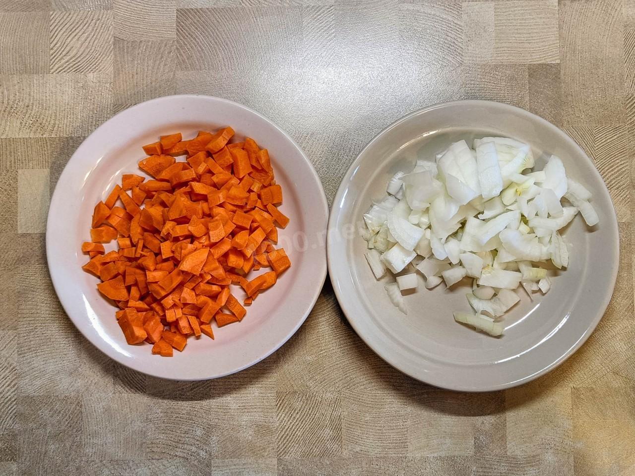 Лук и морковь нарежьте кубиками.
