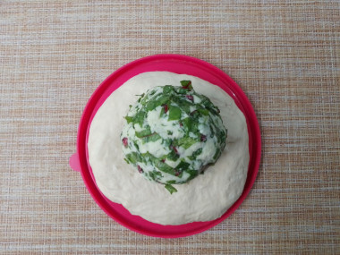 Тесто расплющите в лепешку, положите на нее шарик начинки и соберите тесто вокруг начинки.