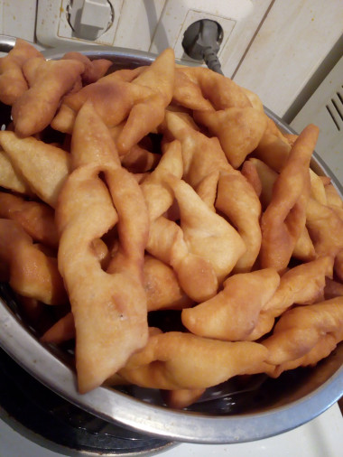 По истечении этого времени раскатайте тесто в пласт толщиной 20-25 мм и разрежьте на прямоугольные кусочки 10 х 5 см. В середине каждого прямоугольника сделайте разрез по вертикали, при этом отступив от верхнего и нижнего края 1,5-2 см. Один край прямоугольника проденьте через отверстие и перекрутите разделенные части вергуна. Т.е. одна часть прямоугольника получается как бы вывернутой наизнанку.