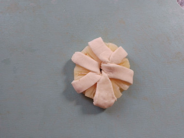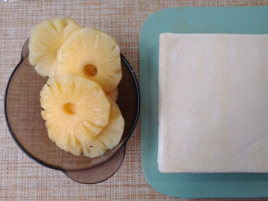 Размороженное слоеное тесто раскатайте в прямоугольник 2-3 мм толщиной и нарежьте на длинные полоски шириной около 1,5 см. Получившиеся полоски должны свободно проходить через вырезанную серединку колечек ананасов. Количество полосок должно быть по количеству колец ананасов.