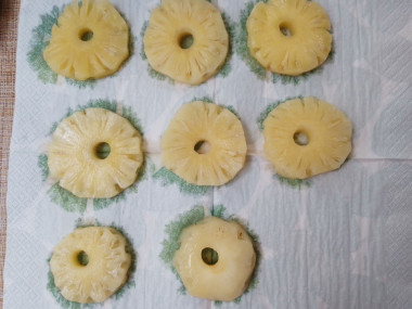 Включите духовку на 180 градусов. Консервированные ананасы выньте из сиропа и обсушите на бумажных салфетках. Кольца ананасов бывают разного размера. У меня кольца небольшого диаметра. Если у вас крупные кольца, то теста на них понадобится больше.