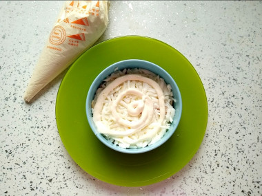 Выложите натертые яйца следующим слоем. Этот слой также смажьте небольшим количеством майонеза.