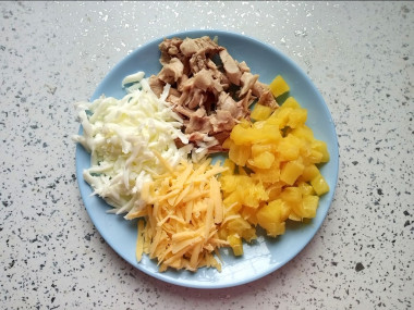 Нашла на сайте рецепт салата с консервированными ананасами и курицей. Все ингредиенты были в наличии, поэтому сразу его и сделала. Курица у меня была отварена с вечера, осталось только нарезать. Сыр натерла на крупной терте. От яиц у меня оставались варёные белки, решила так их и использовать. Мне кажется так даже нежнее получилось. Ананасы были колечками, нарезала их кубиками и отжала, сока в них много. Для удобства майонез переложила в кулинарный мешок. Собранный в кольце салат охладила и мы с мужем дополнили им ужин. Очень вкусно! Сочетание курицы, яиц, ананасов и сыра невероятно удачное! Сладость консервированного ананаса отлично оттеняет этот салат!