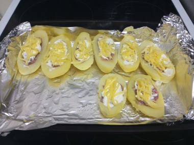 Мои лодочки в духовке выпекались дольше, около часа. Столько времени понадобилось картошке, чтобы дойти до готовности. В следующий раз просто с самого начала картошку чуть дольше поварю.