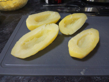 Картошку переложите на блюдо и охладите. Из каждой половинки чайной ложкой аккуратно выньте мякоть, оставив стенки толщиной 5-7 мм. Важно, чтобы в процессе картофель не поломался.