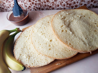 В следующий раз сделаю все еще лучше. Резала на 3 части, но нажо было на 5. Все равно нам очень понравилось. Сметанный крем, шоколадный соус, бананы, стружка. Его почти смели:)))