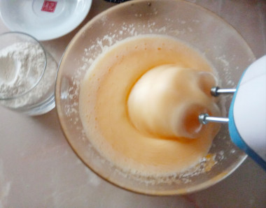 Не останавливая взбивание, начните по ложке добавлять к яйцам сахар. Количество сахара вы можете немного уменьшить в зависимости от своих предпочтений. Вместе с сахаром всыпьте ванилин. Когда весь сахар будет добавлен, продолжите взбивать яйца. Обороты оставьте средними. Чем дольше вы будете их взбивать, тем пышнее получится бисквит. Именно пузырьки воздуха, которые образуются при взбивании, поднимут его при выпечке. Масса должна стать светлой и пышной.