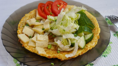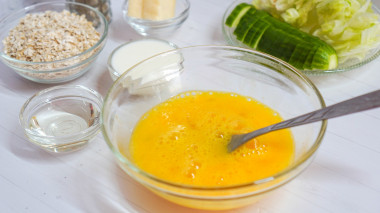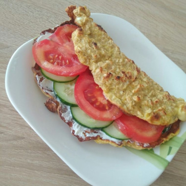 К завтраку решила приготовить овсяноблин для правильного питания ПП. Много слышала о приготовлении овсяноблина, но ни разу раньше его не готовила. Подготовила ингредиенты по списку. В миске взбила два яйца, добавила молоко и овсяные хлопья. Оставила минут на 10, чтобы хлопья набухли, за это время подготовила овощи - свежий огурец и салат айсберг. Овощи помыла, и нарезала небольшими ломтиками. Вместо моцареллы использовала твердый сыр, который тоже нарезала небольшими ломтиками. Сковороду разогрела, добавила растительное масло и влила овсянноблинное тесто. Блин обжаривала на среднем огне примерно по 5 минут с каждой стороны до румяности. Овсяноблин переложила на тарелку и сверху выложила начинку из овощей и сыра. Кстати, от еще теплого блина сыр начал плавиться и стал еще вкуснее. Спасибо автору за рецепт!