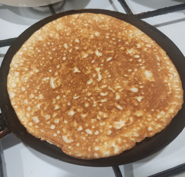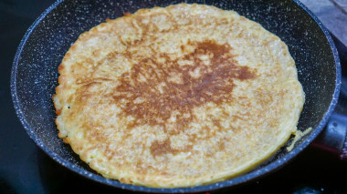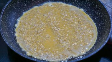 Разогрейте сковороду на сильном огне, слегка смажьте маслом. Уменьшите огонь до умеренного и вылейте на сковороду яичную смесь. Когда блин снизу начнет схватываться переверните его.