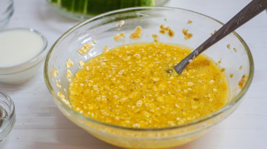 Добавьте к яйцам хлопья и перемешайте венчиком.
