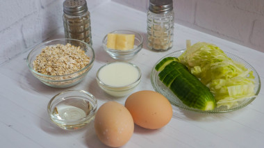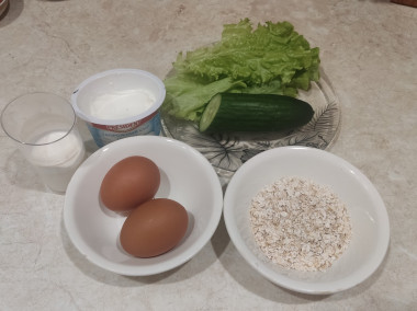 Калорийность продуктов: Овсяные хлопья, Молоко, Яйца, Соль, Моцарелла, Огурцы, Кресс-салат, Растительное масло