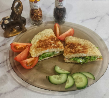 Овсяноблин выложила на тарелку, смазала творожным сыром одну половину, добавила листья салата и огурчик. Закрыла второй половиной и слегка прижала.
