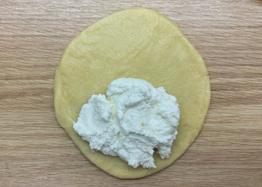 Накройте начинку второй половинкой лепешки, чуть прижмите, чтобы получился сочник в виде полукруга. Края не соединяйте, начинка должна немного "выглядывать" из-под верхнего слоя теста.
