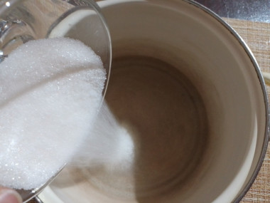 Добавьте подготовленный сахар и поставьте ковш на огонь. Помешивая, доведите воду с сахаром до кипения. Кипятить не надо, достаточно , чтобы сахар полностью растворился в горячей воде.