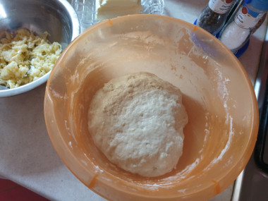 Готовое тесто мягкое, эластичное и почти не липнет к рукам. Чтобы не забивать тесто лишней мукой, в конце замеса смажьте руки растительным маслом и мните тесто руками. Готовое тесто накройте полотенцем и уберите в теплое место на 1 час, чтобы оно подошло.