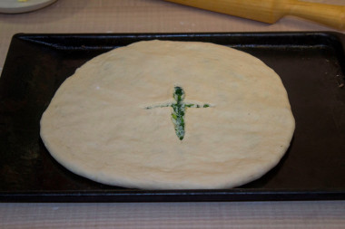Переверните лепешку швом вниз и немного раскатайте скалкой в круг, примерно 30-35 см в диаметре. В центре лепешки сделайте небольшое отверстие для выхода пара. Поставьте лепешку в духовку, предварительно разогретую до 180 градусов, примерно на 30 минут. При выпекании ориентируйтесь по своей духовке.