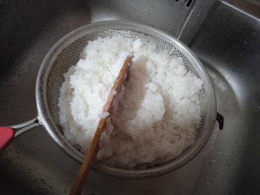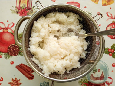 Готовый рис откиньте на дуршлаг и промойте холодной водой. Дайте стечь лишней воде.