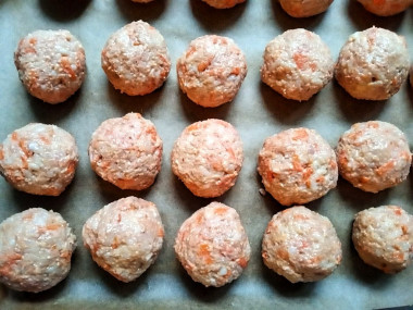 Форму для запекания выстелите фольгой или бумагой для выпечки. О том, как выбрать форму для запекания, читайте в отдельной статье по ссылке в конце рецепта. Слепите из фарша шарики небольшого размера. Выложите их в форму. Учитывайте, что тефтели при запекании уменьшатся в размере.