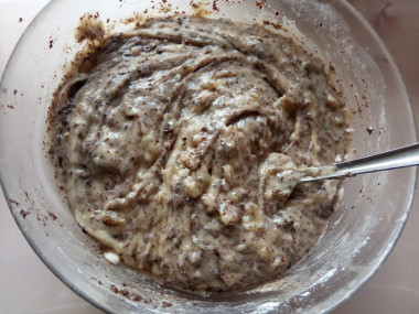 Переложите тесто в удобную ёмкость, добавьте бананы и шоколад. Шоколад можно измельчить несколькими способами: порубить острым ножом на доске, натереть на крупной терке прямо в миску или завернуть в пергамент и разбить молотком. Если шоколад липкий, охладите его 15 минут в морозилке. Количество шоколада можете увеличить или уменьшить по вкусу.