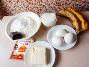 Подготовьте необходимые продукты: яйца, сахар, сливочное масло, бананы, разрыхлитель, шоколад, мука. Яйца и сливочное масло заранее достаньте из холодильника, чтобы они стали комнатной температуры. О свойствах разрыхлителя можно отдельно прочитать важную статью, ссылка на которую находится под рецептом.