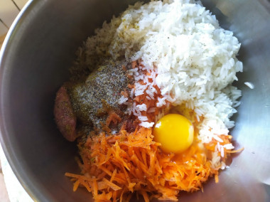 Подготовьте плоскую тарелку с пшеничной мукой. В отдельной миске смешайте основные ингредиенты: мясной фарш, тертую морковь, полувареный рис, сырое куриное яйцо. Всё посолите и поперчите.