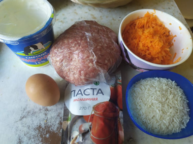 Калорийность продуктов: Фарш мясной, Рис, Морковь, Куриные яйца, Томатная паста, Сметана, Пшеничная мука
