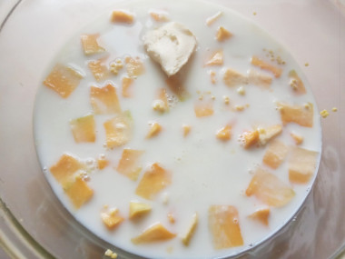 К завтраку приготовила пшенную кашу с тыквой в духовке. Крупу для каш я обычно подготавливаю накануне. Вечером хорошо промыла пшено, залила его на пять минут кипятком для удаления горечи, промыла ещё раз холодной водой и оставила в воде на ночь. Утром откинула пшено через сито, выложила в форму для запекания ( у меня кастрюля из огнестойкого стекла с крышкой), туда же нарезала небольшими кусочками очищенную тыкву, слегка присолила, добавила сахар, мед, масло и молоко и отправила кастрюлю в духовку. Каша готовилась примерно 40 минут. За это время крупа полностью впитала в себя молоко, получилась рассыпчатой, разваристой, с тонким тыквенно-медовым