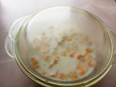 Пшено тщательно переберите и хорошенько промойте, пока вода не станет совсем прозрачной. Залейте пшено кипятком и оставьте на 2-3 минуты. Это необходимо, чтобы убрать горечь из крупы.