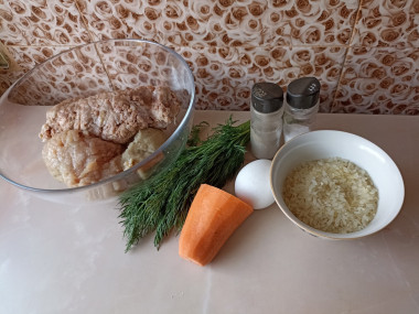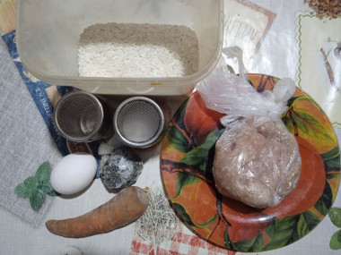 Калорийность продуктов: Фарш мясной, Пропаренный рис, Морковь, Яйца, Укроп, Перец черный молотый, Соль