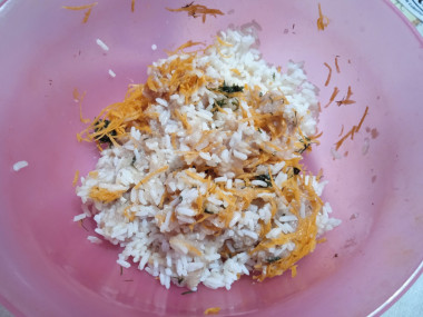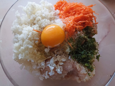 В миске соедините фарш, рис, морковь, яйцо и укроп. Все посолите, поперчите. По желанию можете добавить свои любимые специи.