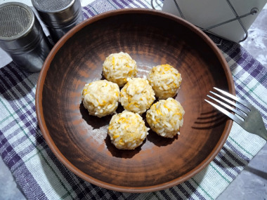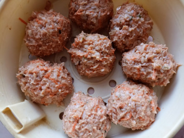 Сформируйте из получившегося фарша небольшие круглые тефтели и выложите их в специальную чашу с дырочками на дне для приготовления на пару. В мою чашу поместилось 8 тефтелей. Оставшиеся 4 тефтельки я сложила в пакет и заморозила.