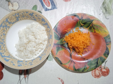 Рис предварительно отварите в большом количестве подсоленной воды до полуготовности. На это нужно вполовину меньше времени. Если до полной готовности нужно варить рис 15 минут, значит для состояния полуготовности его нужно варить 7-8 минут. Поэтому читайте инструкцию на упаковке! Рис лучше использовать пропаренный, чтобы он сохранил форму во время варки и приготовления на пару. Рис откиньте на дуршлаг и охладите. Он должен получиться рассыпчатым.