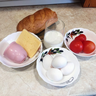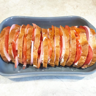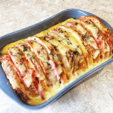 3. Смажьте форму для пирога сливочным маслом и выложите в нее ломтики батона. Если укладывать батон неудобно - отрежьте от ломтиков кусочки по форме формы. Между ломтиками уложите помидоры и колбасу. Залейте яичной заливкой. Посыпьте сыром (если сыр ломтиками, лучше вложить его между хлебом и колбасой с помидорами).
