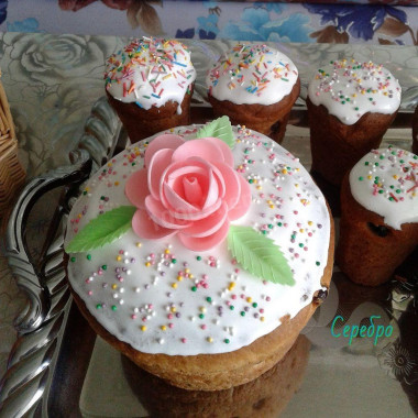 Очень простой в приготовлении рецепт, а тесто получается вкуснейшее и очень пышное. Можно вместо изюма натереть цедру от половины лимона и выпекать просто большой кекс - очень вкусно. Форма заполняется на одну треть, затем при расстойке поднимается тесто ещё и в духовке ещё до верха формы. Я смазываю куличики самой простейшей помадкой: взять стакан сахарной пудры и добавлять в нее по капле кипяченную воду комнатной температуры, каждый раз перемешивая. Когда смесь станет как густая сметана - смазать ею куличики и сразу посыпать украшениями, пока помадка не застыла. Дать подсохнуть и готово. Помадка получается красивая с подтёками. А водичку нужно добавлять именно по капле, т.к. сахарная пудра быстро промокает и главное - не перелить водички. В помадку можно добавить красители, либо какао.