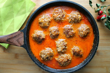 Залейте тефтели на сковороде томатным соусом и тушите их на слабом огне около 10 минут. Точное время определяйте по своей плите.