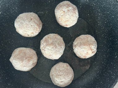 Разогрейте на плите сковороду с растительным маслом. Обжарьте тефтели, аккуратно их переворачивая на разные стороны. Нужно, чтобы на них появилась румяная корочка.