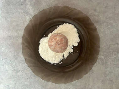 Мокрыми руками сформируйте из мясного фарша круглые тефтели. Насыпьте в плоскую тарелку 2-3 столовые ложки пшеничной муки. Обваляйте каждую тефтельку в муке со всех сторон.