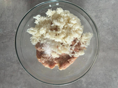 Свинину перекрутите через мясорубку вместе с репчатым луком. Чтобы было удобнее, разрежьте луковицу на 4 части (не забудьте удалить "попки").