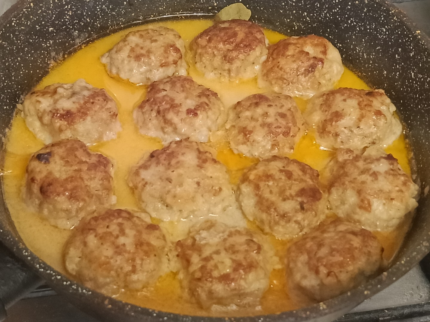 Вот такие они получаются у меня в процессе жарки. Обратите внимание, что тефтели должны поместиться на сковороде все.