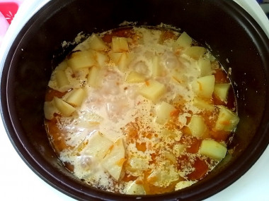 Теперь остается добавить в чашу к сердечкам картофель, положить лавровый листик, перемешать и закрыть мультиварку крышкой. Клапан для выхода пара должен быть закрыт.