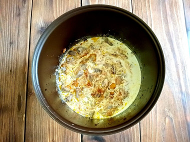 Куриные сердечки обычно наполнены кровью, поэтому после очистки от жира замочила их в холодной воде на пол часа. Потом промыла и разрезала пополам. Как и рекомендуется, выставила режим "жарка" на 15 минут, это оптимальное время, мне кажется. После обжаривания сердечек с луком и морковью добавила сметану. Честно говоря, думала, что при тушении сметана пойдет хлопьями и вид у блюда будет не очень. Но все прошло хорошо, картошка получилась очень нежной и вкуснейший бархатистый соус в придачу. Картошку тушила пол часа, чтобы она хорошо разварилась. Сердечки стали мягкими, отлично пропитались сметанной подливкой.
