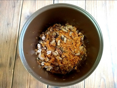 Мультиварку включить в режим жарки, время выставить – 15 минут. В чашу налить растительное масло, разогреть его в течение минуты и выложить лук с морковкой. Жарить, помешивая, 5 минут, затем добавить соль и специи.