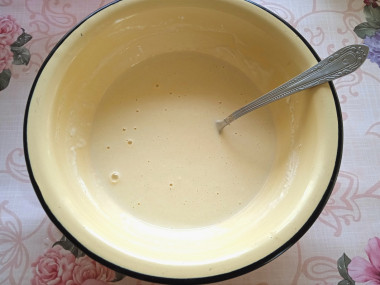 Соедините все ингредиенты для блинного теста в глубокой емкости и тщательно перемешайте с помощью миксера. Потратьте на приготовление теста 3-4 минуты.