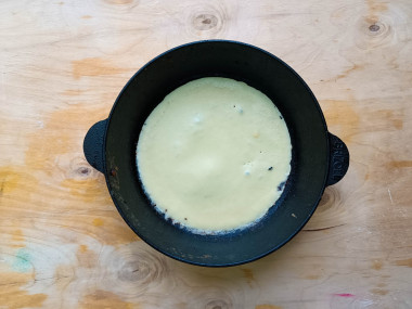 Подготовьте сковородку для жарки: слегка смажьте ее растительным маслом и хорошенько разогрейте. Огонь сделайте чуть выше среднего. Я жарила сразу на двух сковородках. Наливайте на горячую сковороду немного теста и быстро распределите по всей сковороде круговыми движениями. Жарьте примерно полминуты с одной стороны.